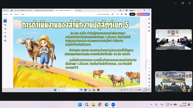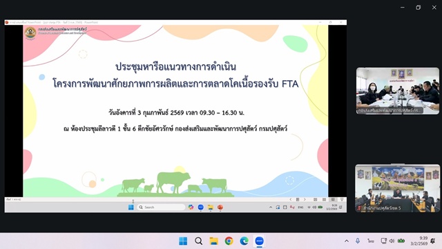 วันอังคารที่ 3 กุมภาพันธ์ 2569 เวลา 09.30 น. นายสัตวแพทย์พืชผล น้อยนาฝาย ปศุสัตว์เขต 5 พร้อมด้วยนายสุเทพ สุขผล ผู้อำนวยการส่วนส่งเสริมและพัฒนาการปศุสัตว์ และนางสาวกนกพร พวงเงินมาก นักวิชาการสัตวบาลชำนาญการ สำนักงานปศุสัตว์เขต5 เข้าร่วมประชุมหารือแนวทางการดำเนินโครงการพัฒนาศักยภาพการผลิตและการตลาดโคเนื้อรองรับ FTA ผ่านระบบ สื่อสารออนไลน์ VDO Conference ZOOM (Zoom meeting) โดยมีนายสัตวแพทย์มนัส เทพรักษ์ รองอธิบดีกรมปศุสัตว์ เป็นประธานการประชุมหารือแนวทางการดำเนินโครงการพัฒนาศักยภาพการผลิตและการตลาดโคเนื้อรองรับ FTA เพื่อพิจารณาหาวิธีการแก้ไขปัญหา และแนวทางการดำเนินโครงการพัฒนาศักยภาพการผลิตและการตลาดโคเนื้อรองรับ FTA และชี้แจงแผนกำหนดการลงพื้นที่ติดตามโครงการพัฒนาศักยภาพการผลิตและการตลาดโคเนื้อรองรับ FTA ในพื้นที่จังหวัดเชียงราย จังหวัดตาก จังหวัดนครสวรรค์ จังหวัดชัยนาท จังหวัดราชบุรี และจังหวัดสุพรรณบุรี