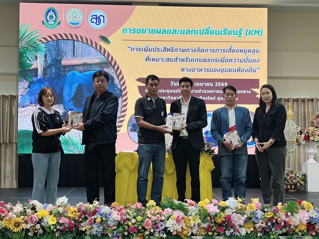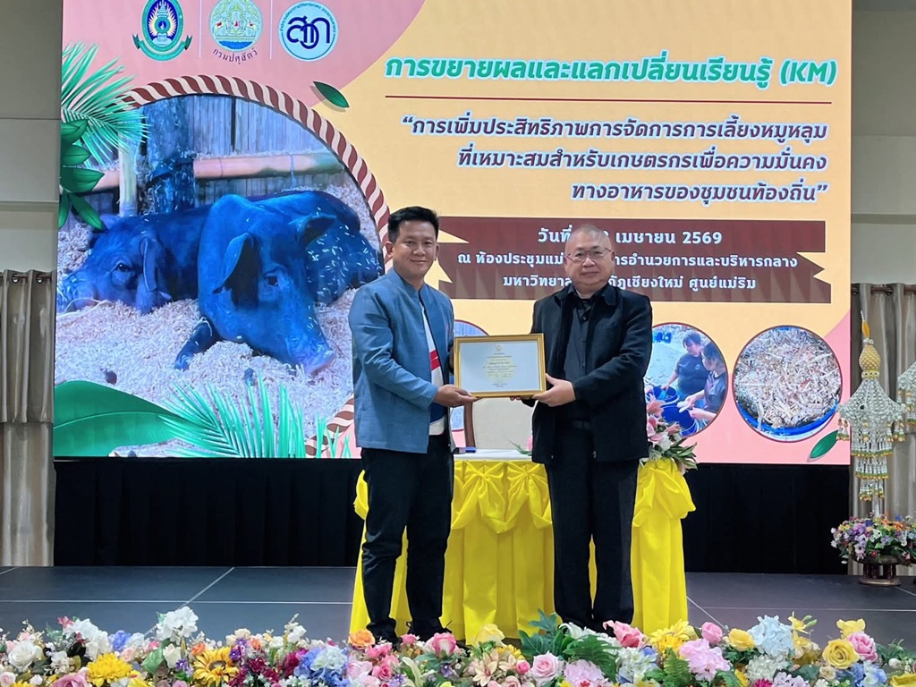 วันที่ 7 เมษายน 2569 เวลา 10.00 น. นายพืชผล น้อยนาฝาย ปศุสัตว์เขต 5 มอบหมายให้นางมณิชญา ประชุม ผู้อำนวยการส่วนมาตรฐานการปศุสัตว์ และนายพชร ศรีประสาท นายสัตวแพทย์ชำนาญการพิเศษ เข้าร่วมงานถ่ายทอดองค์ความรู้การเลี้ยงหมูหลุม พร้อมพิธีมอบใบรับรองฟาร์มมาตรฐานหมูหลุมแห่งแรกของจังหวัดเชียงใหม่ ภายใต้โครงการ “การเพิ่มประสิทธิภาพการจัดการการเลี้ยงหมูหลุมที่เหมาะสมสำหรับเกษตรกร เพื่อความมั่นคงทางอาหารของชุมชนท้องถิ่น” ณ ห้องประชุมอาคารอำนวยการและบริหารกลาง มหาวิทยาลัยราชภัฏเชียงใหม่ ศูนย์แม่ริม โดยการจัดโครงการในครั้งนี้ถือเป็นการบูรณาการร่วมกันระหว่างสถาบันการศึกษาและหน่วยงานภาครัฐ เพื่อผลักดันให้เกษตรกรผู้เลี้ยงหมูหลุม ให้มีความมั่นคงทางอาชีพ และสร้างแหล่งผลิตอาหารที่ปลอดภัยให้กับชุมชนท้องถิ่นอย่างยั่งยืนต่อไป