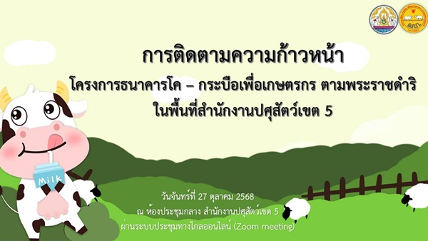 วันที่ 27 ตุลาคม 2568 เวลา 09.00 น. น.สพ. พืชผล น้อยนาฝาย ปศุสัตว์เขต 5 เป็นประธานการประชุมติดตามการดำเนินงานโครงการอันเนื่องมาจากพระราชดำริ ในพื้นที่ปศุสัตว์เขต 5 ณ ห้องประชุมกลาง สำนักงานปศุสัตว์เขต 5 อำเภอเมืองเชียงใหม่ จังหวัดเชียงใหม่ และผ่านระบบประชุมทางไกลออนไลน์ (Zoom Meeting) โดยมีนายสุเทพ สุขผล ผู้อำนวยการส่วนส่งเสริมและพัฒนาการปศุสัตว์, นายรังสิมันต์ พุ่มทอง เจ้าพนักงานสัตวบาลอาวุโส หัวหน้างานปศุสัตว์ ศูนย์ศึกษาและพัฒนาการห้วยฮ่องไคร้ฯ พร้อมด้วยเจ้าหน้าที่ส่วนส่งเสริมฯ สำนักงานปศุสัตว์เขต 5 และหัวหน้ากลุ่มส่งเสริมและพัฒนาการปศุสัตว์ สำนักงานปศุสัตว์จังหวัดทั้ง 8 จังหวัดในพื้นที่ปศุสัตว์เขต 5 เข้าร่วมประชุม โดยมีประเด็นเรื่องเพื่อทราบได้แก่ ระบบการแจ้งเตือนข้อมูลทะเบียนสัตว์, สรุปผลการดำเนินโครงการธนาคารโค-กระบือฯ ในพื้นที่ปศุสัตว์เขต 5, กรณีแจ้งเตือน 3 กรณี (ลูกครบอายุ 18 เดือน ยังไม่ส่งคืนโครงการฯ, แม่สัตว์โครงการฯ อายุครบ 3 ปี ยังไม่มีลูกเกิด, แม่สัตว์โครงการฯ อายุครบ 5 ปี ยังไม่ได้มอบกรรมสิทธิ์) และความก้าวหน้าการปฏิบัติงานโครงการอันเนื่องมาจากพระราชดำริ รวมทั้งกิจกรรมพัฒนาพื้นที่สูงอย่างยั่งยืน และประเด็นเรื่องเพื่อพิจารณา ได้แก่ ประเด็นปัญหา ข้อเสนอแนวทางการแก้ไขปัญหา สู่การขับเคลื่อนนโยบายด้านปศุสัตว์ โครงการธนาคารโค-กระบือฯ และโครงการอันเนื่องมาจากพระราชดำริ ในพื้นที่ปศุสัตว์เขต 5 ของแต่ละจังหวัด