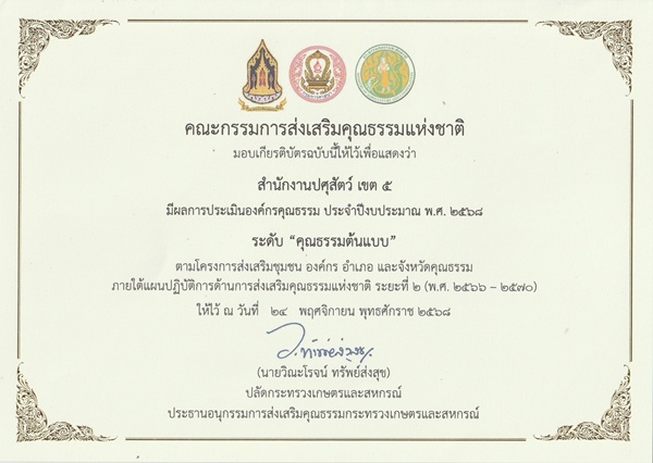 ตามที่กรมปศุสัตว์ได้ดำเนินการ ประเมินองค์กรคุณธรรม ประจำปีงบประมาณ พ.ศ 2568 โดยดำเนินการตามหลักเกณฑ์และวิธีการที่คณะกรรมการส่งเสริมคุณธรรมแห่งชาติกำหนด กระทรวงเกษตรและสหกรณ์ ได้แจ้งผลการประเมินของคณะกรรมการส่งเสริมคุณธรรมแห่งชาติ โดยพิจารณาเห็นชอบให้ กรมปศุสัตว์และหน่วยงานในสังกัด เป็นองค์กรคุณธรรมต้นแบบ และปลัดกระทรวงเกษตรและสหกรณ์ได้มอบเกียรติติบัตรองค์กรคุณธรรมต้นแบบ ประจำปีงบประมาณ พ.ศ. 2568 ให้กับสำนักงานปศุสัตว์เขต 5 เพื่อเป็นการประกาศยกย่องและสร้างกำลังใจให้กับเจ้าหน้าที่ของหน่วยงาน