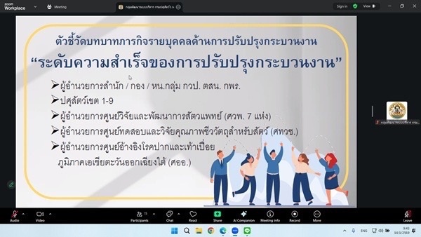 วันที่14 มกราคม 2569 นายสัตวแพทย์พืชผล น้อยนาฝาย ปศุสัตว์เขต 5 มอบหมายให้ นายวุฒิชัย คำดี ผู้อำนวยการส่วนยุทธศาสตร์และสารสนเทศการปศุสัตว์ และเจ้าหน้าที่ของแต่ละส่วน/ฝ่าย เข้าร่วมประชุมชี้แจงรายละเอียดตัวชี้วัดรายบุคคล ด้านการปรับปรุงกระบวนงานตามตัวชี้วัด “ระดับความสำเร็จของการปรับปรุงกระบวนงาน” ประจำปี พ.ศ. 2569 ผ่านระบบ Zoom ณ ห้องประชุมสำนักงานปศุสัตว์เขต 5